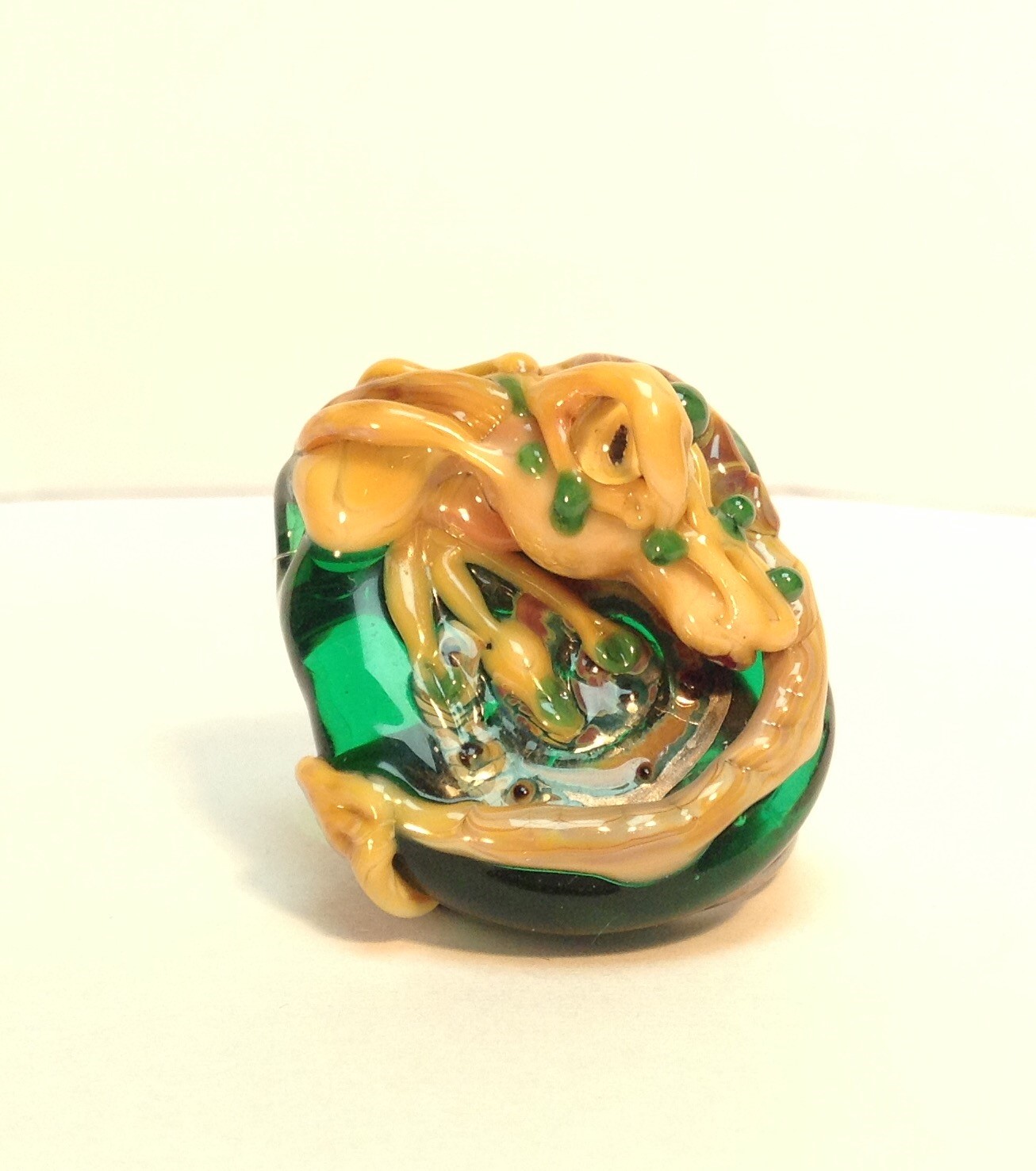 Transparent Emerald Green mount, Stone ground dragon with raku frit, handmade glass lampwork bead with the hole running from side to side.